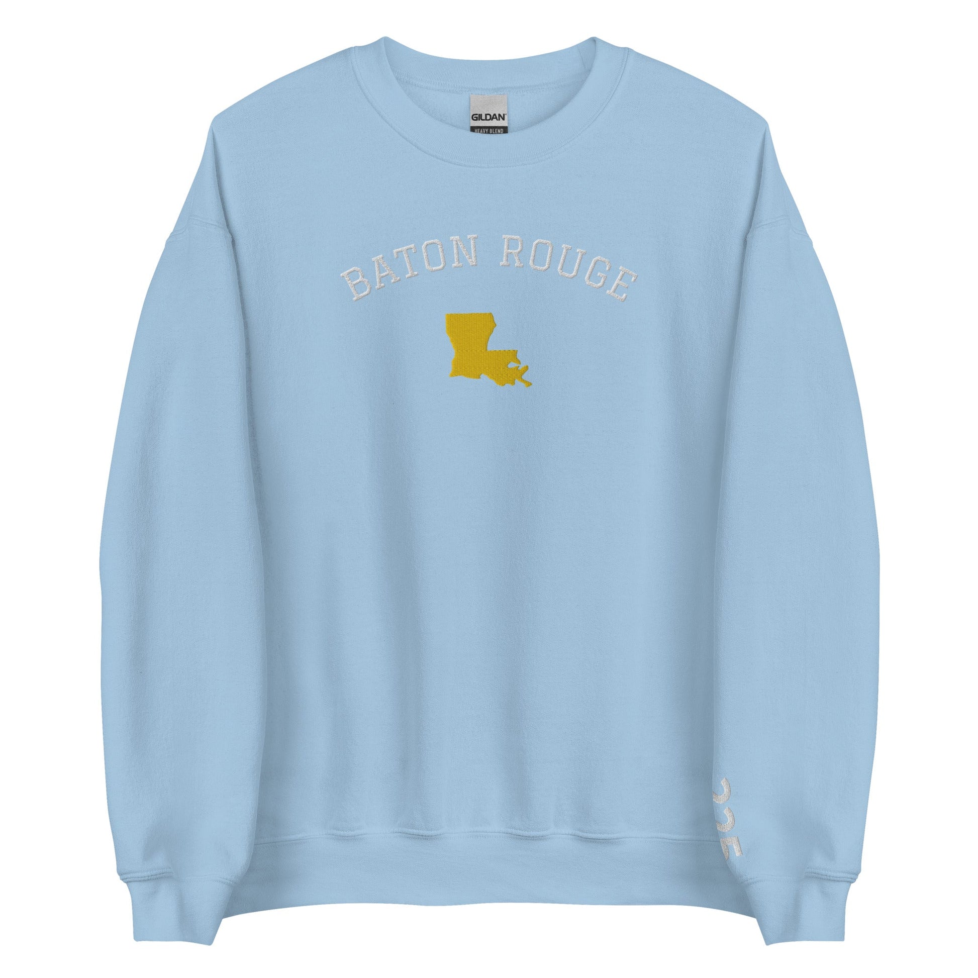 Baton Rouge, Louisiana with a crew neck sweatshirt. The city name and state shape is embroidered on the front and accented with a satin stitch border. The area code is also stitched on the left sleeve.