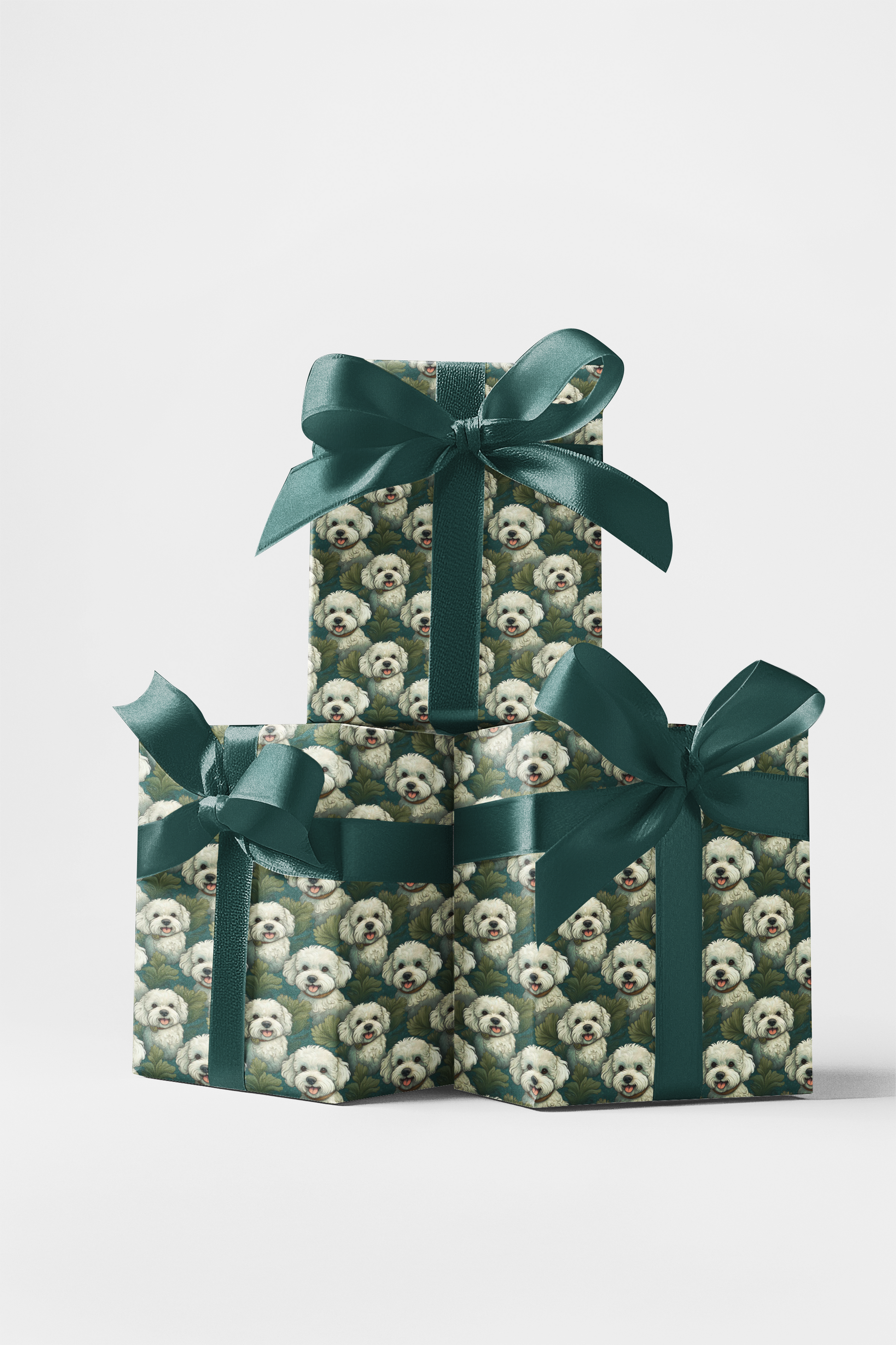 Add a touch of charm to your gifts with our "Bichon Bounce" Wrapping Paper and Tag Set! This delightful design features happy white Bichon Frise pups with cute brown collars, surrounded by lush green foliage on a rich teal background. Elegant yet playful, it’s perfect for dog lovers and any occasion worth celebrating.