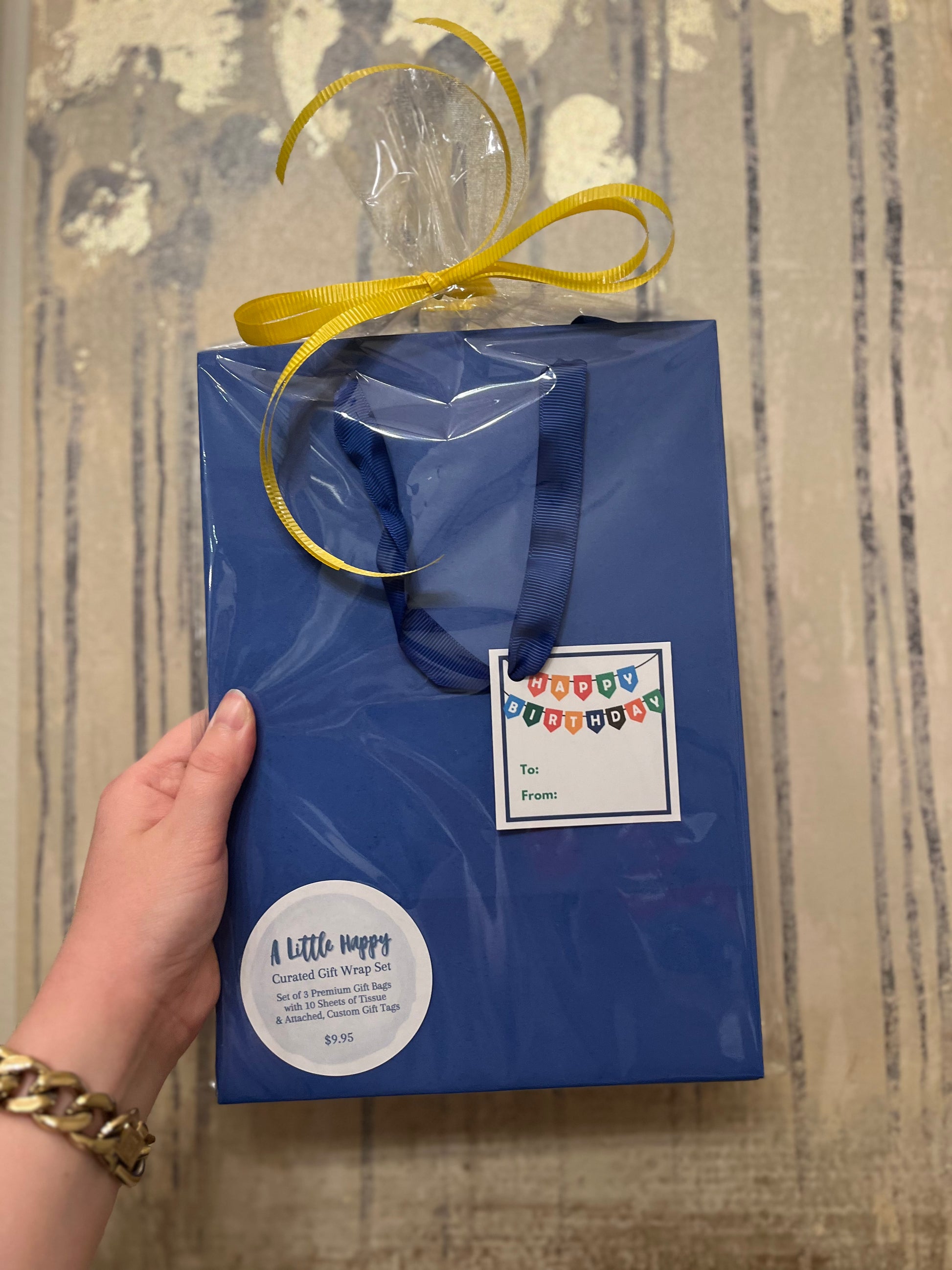 Includes a set of 3 premium gift bags, each with 10+ sheets of luxe white tissue and an attached, coordinating gift tag — thoughtfully designed by A Little Happy, to make your gifting effortless and elevated. No last-minute runs for bags or tissue. No mismatched wrapping. Just beautiful, ready-to-go gifting!