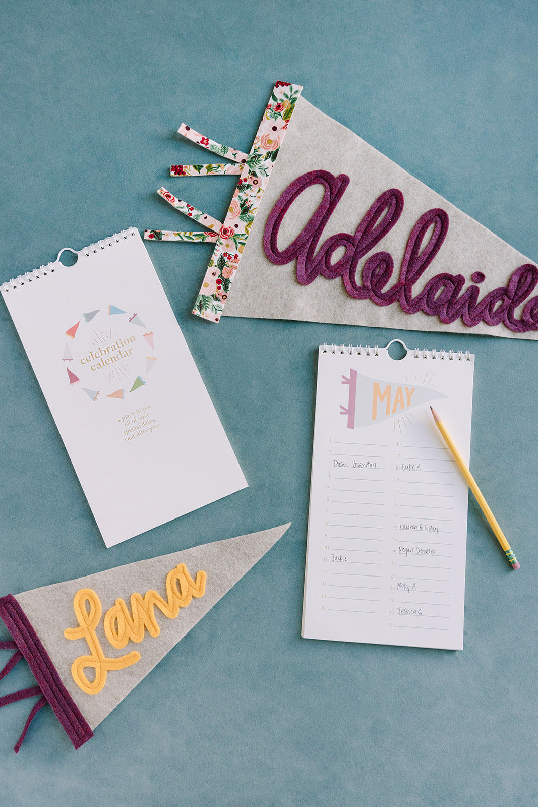 [Printed on matte cream paper, a little lighter than pictured, and top-bound. Hanging supplies not included. Calendar includes all 12 months with blanks next to each date for filling in names/celebrations. Colors on each month's pennant differ.]