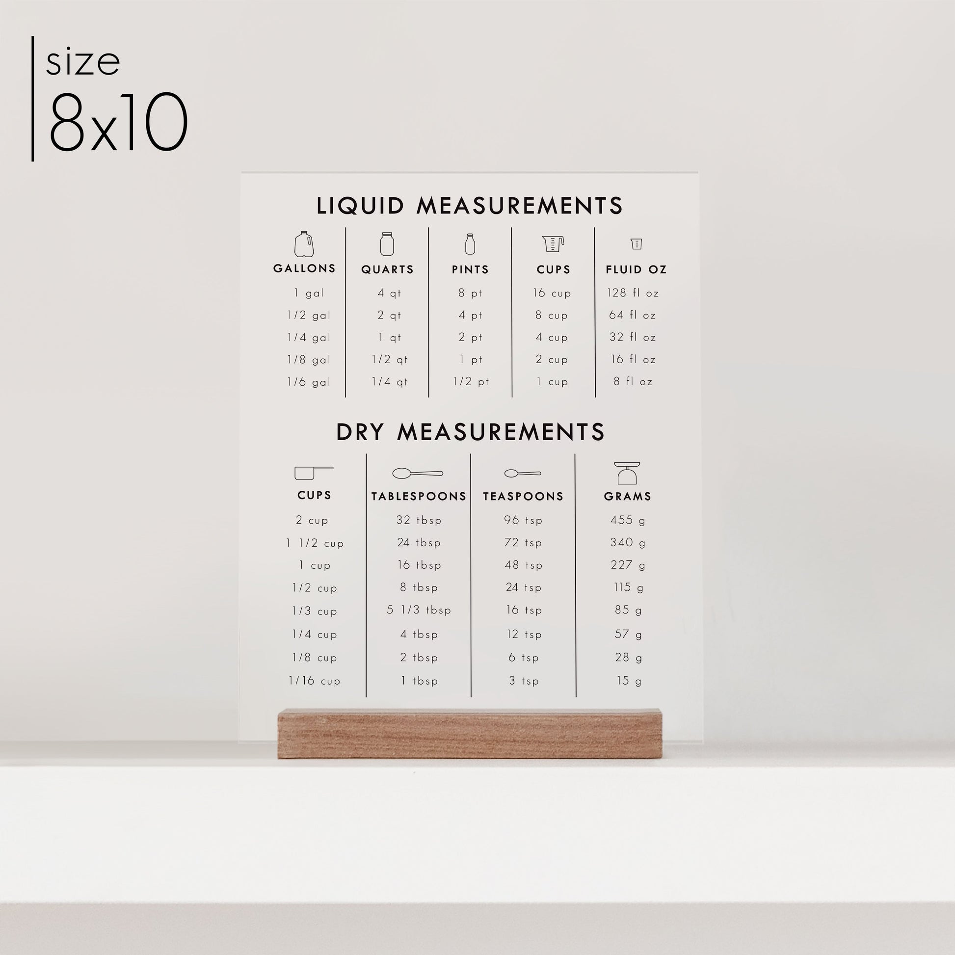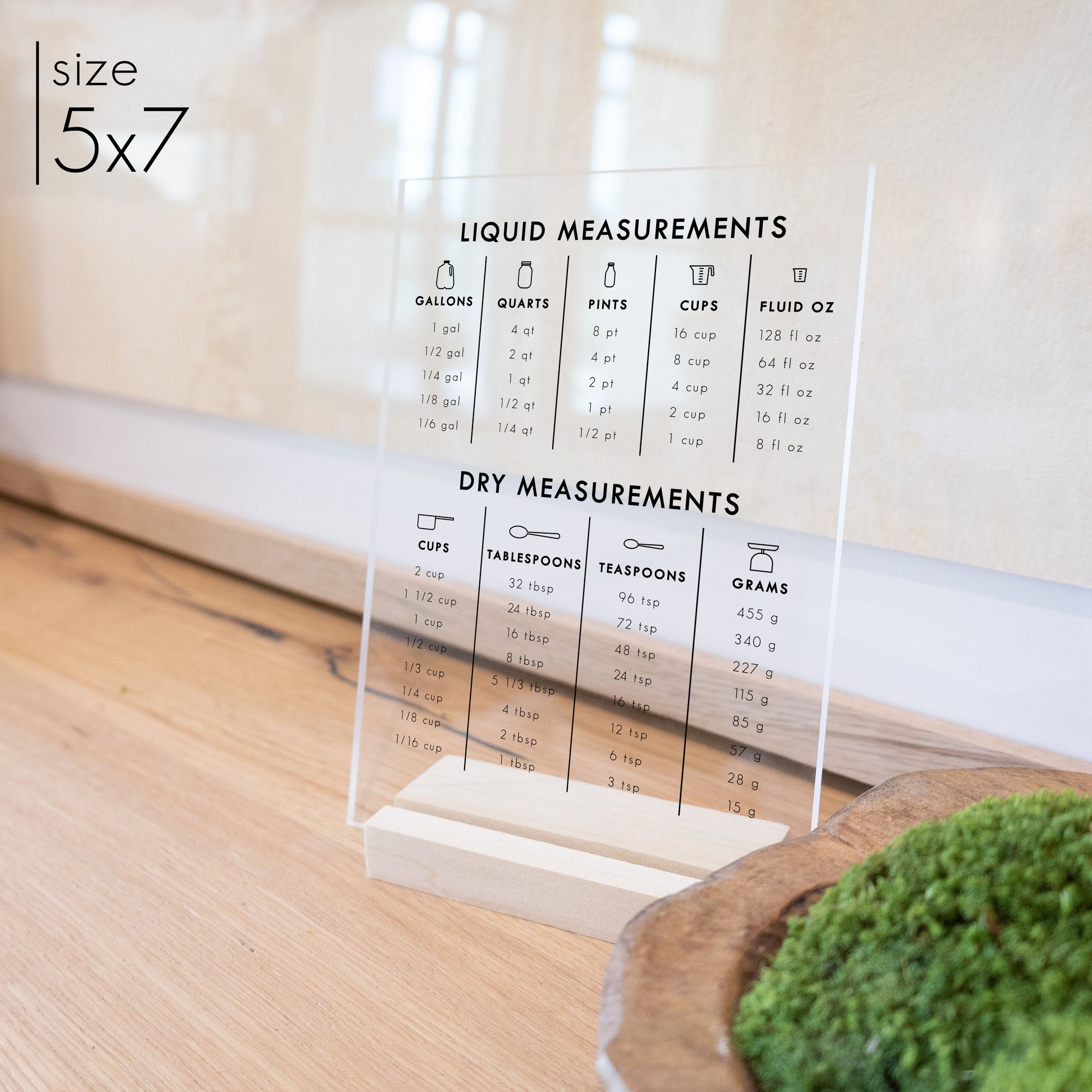 Make cooking and baking easier with this kitchen conversion chart! This clear acrylic chart features a comprehensive list of conversions for liquid and weight measurements. The easy-to-read font makes it perfect for quick reference, and the wood stand makes it easy to display on any flat surface! This acrylic cooking conversion chart makes a great gift for any cook or baker. Order your Kitchen Conversion Chart today and start cooking and baking with confidence!