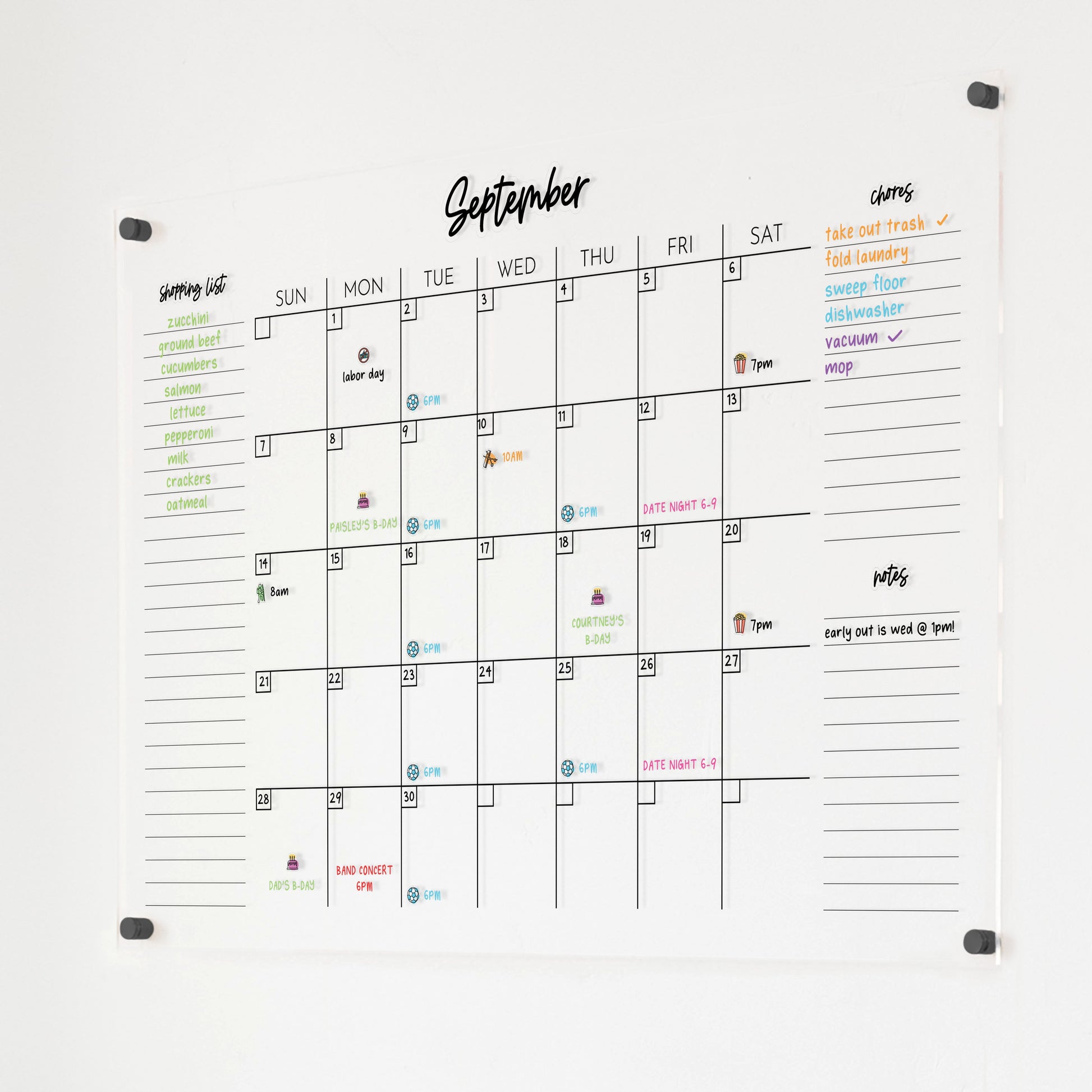 Keep your family organized with our acrylic dry erase wall calendar with interchangeable titles — a stylish and flexible solution that adapts as your needs change. Unlike traditional calendars with permanent labels, this one includes static cling titles in two font styles (cursive & block) so you can swap them anytime. We’ve included the most popular side titles to keep you on track: Shopping List, Chores, To‑Do, Priorities, Birthdays, Goals, Groceries, Upcoming, Menu, Don’t Forget, Reminders, Notes. You can use the included clings or write your own for a truly custom setup.