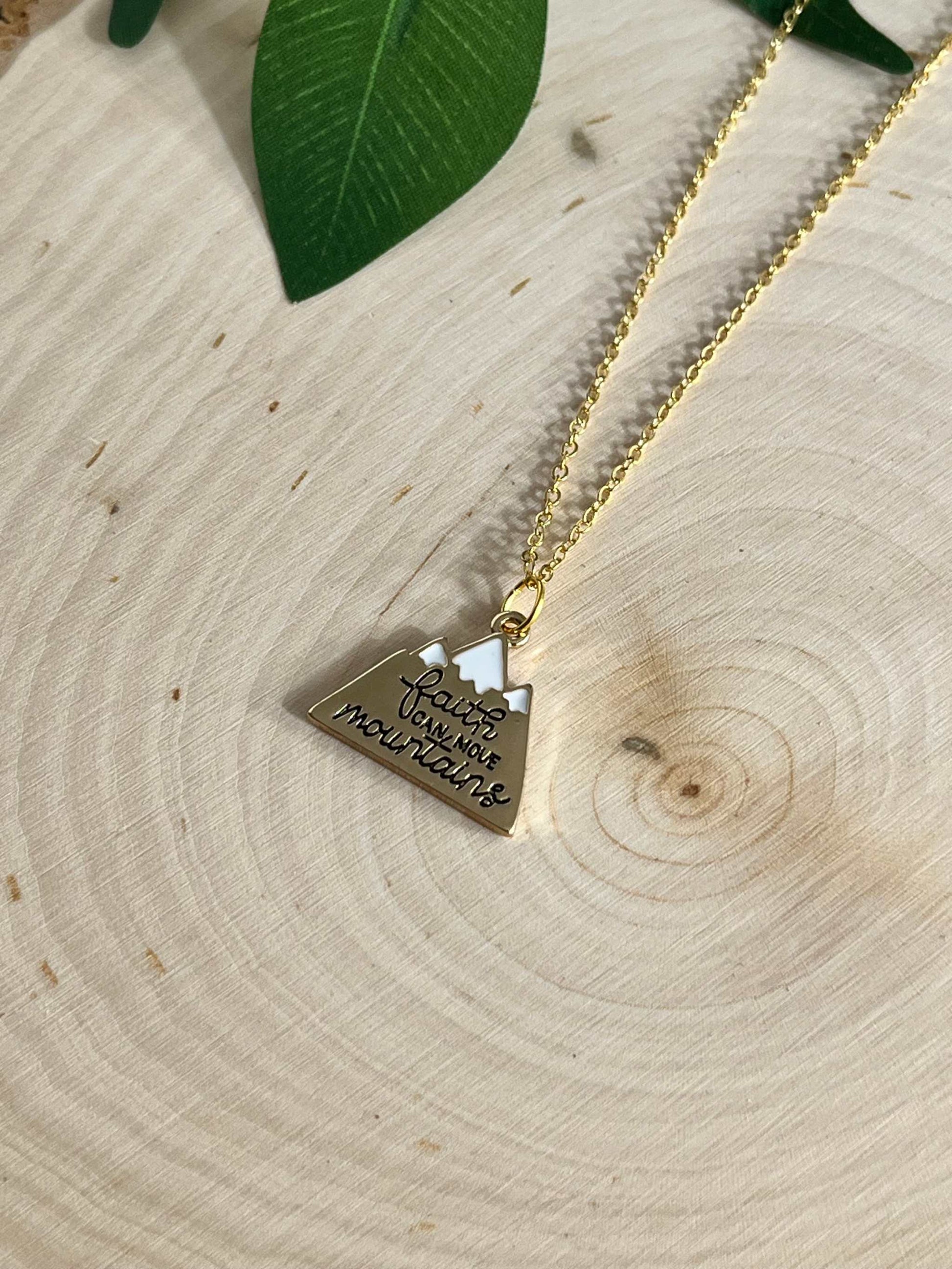 This gold necklace features a "Faith Can Move Mountains" pendant, inspired by Matthew 17:20. Made with 16K gold and an 18” chain, this gold necklace is hypoallergenic, nickel-free, and has an anti-tarnish finish for lasting shine. It's an ideal Christian gift or personal keepsake, offering a daily reminder of the power of faith.