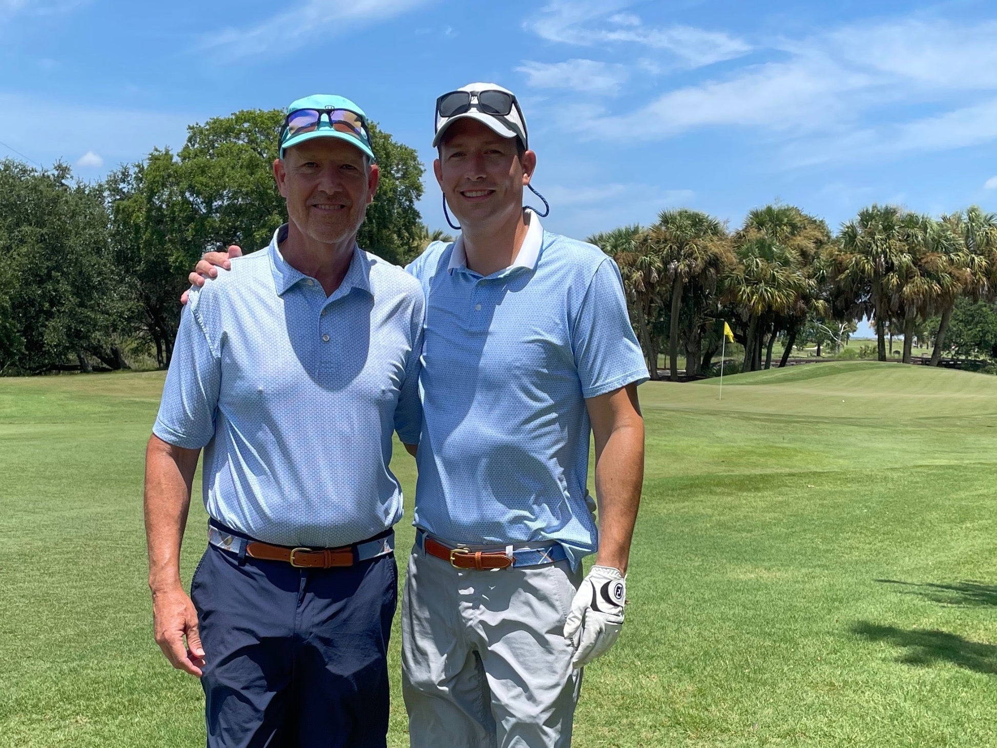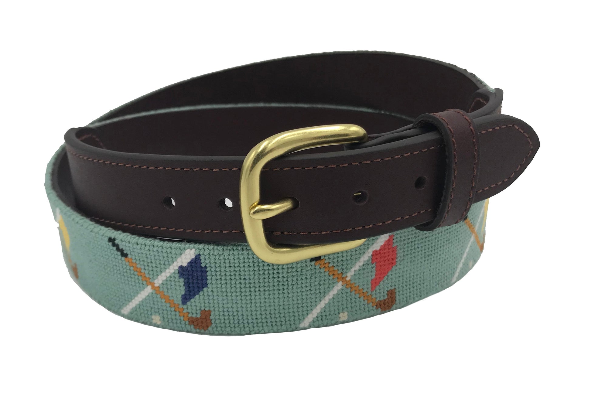 This marvelous golf belt boasts a navy blue, dark baby blue, or mint base with multi-colored golf clubs, golf ball, & flags to delight even the most finicky taste. The blue option has a tan leather finish; navy & mint are framed with dark brown leather. This timeless style is one of our most sought-after belt designs. It's the perfect gift for golf-lovers; impeccably crafted with all natural fibers & materials, 100% hand-stitched needlepoint & cotton thread, plus top-quality Cowhide leather & brass buckle. Comfort & durability guaranteed in the 1.25" width. Exclusively produced by Charleston Belt, our designs capture the spirit of outdoor living with natural fabrics, clean lines, & classic colors.