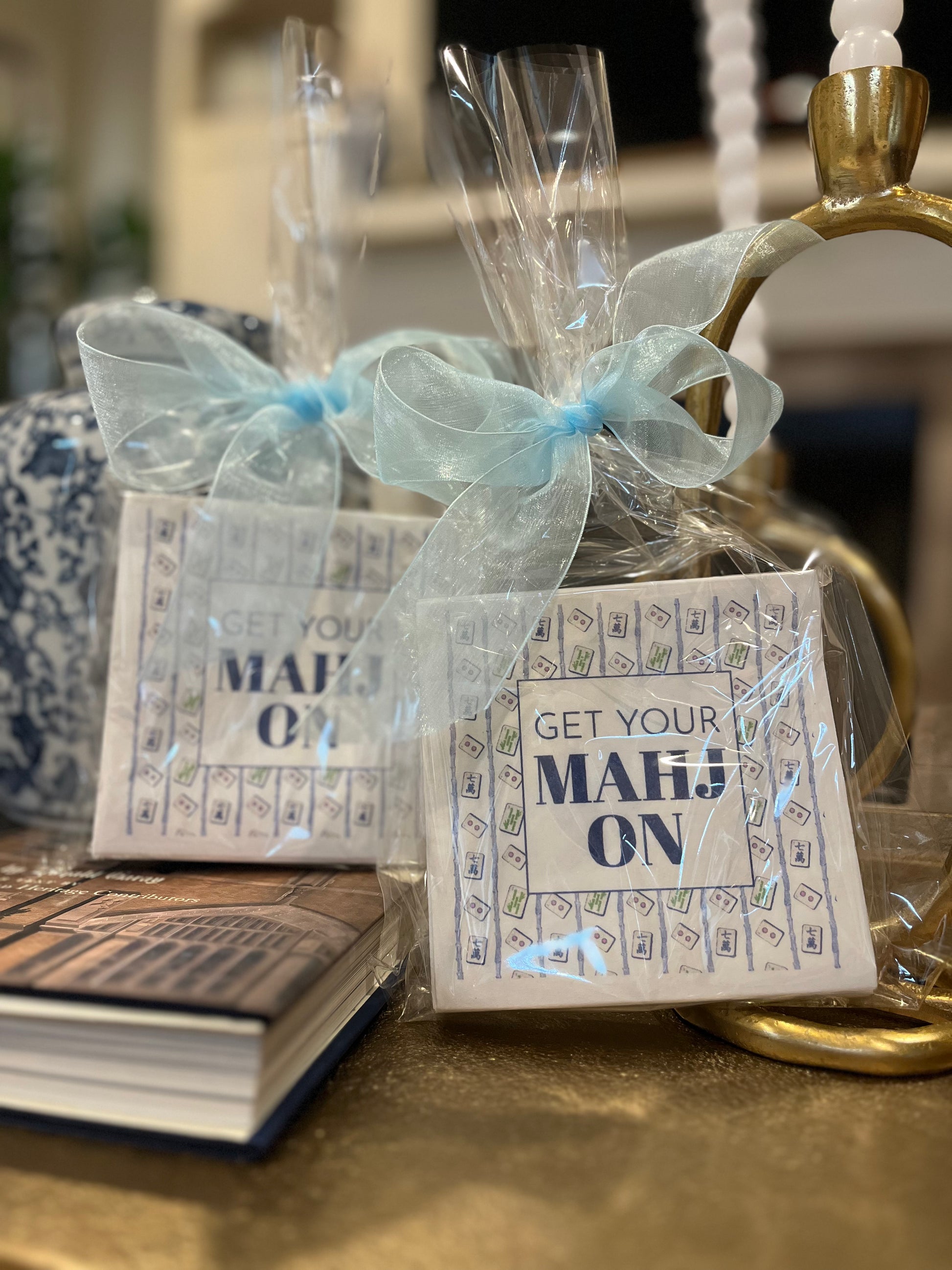 Sip, jot, and play in style! Mahjong-themed cocktail napkins are here to elevate your next game night. These come wrapped in cellophane with a 1.5" Organza Bow, making them a perfect hostess gift or "little happy" for your Mahjong crew!