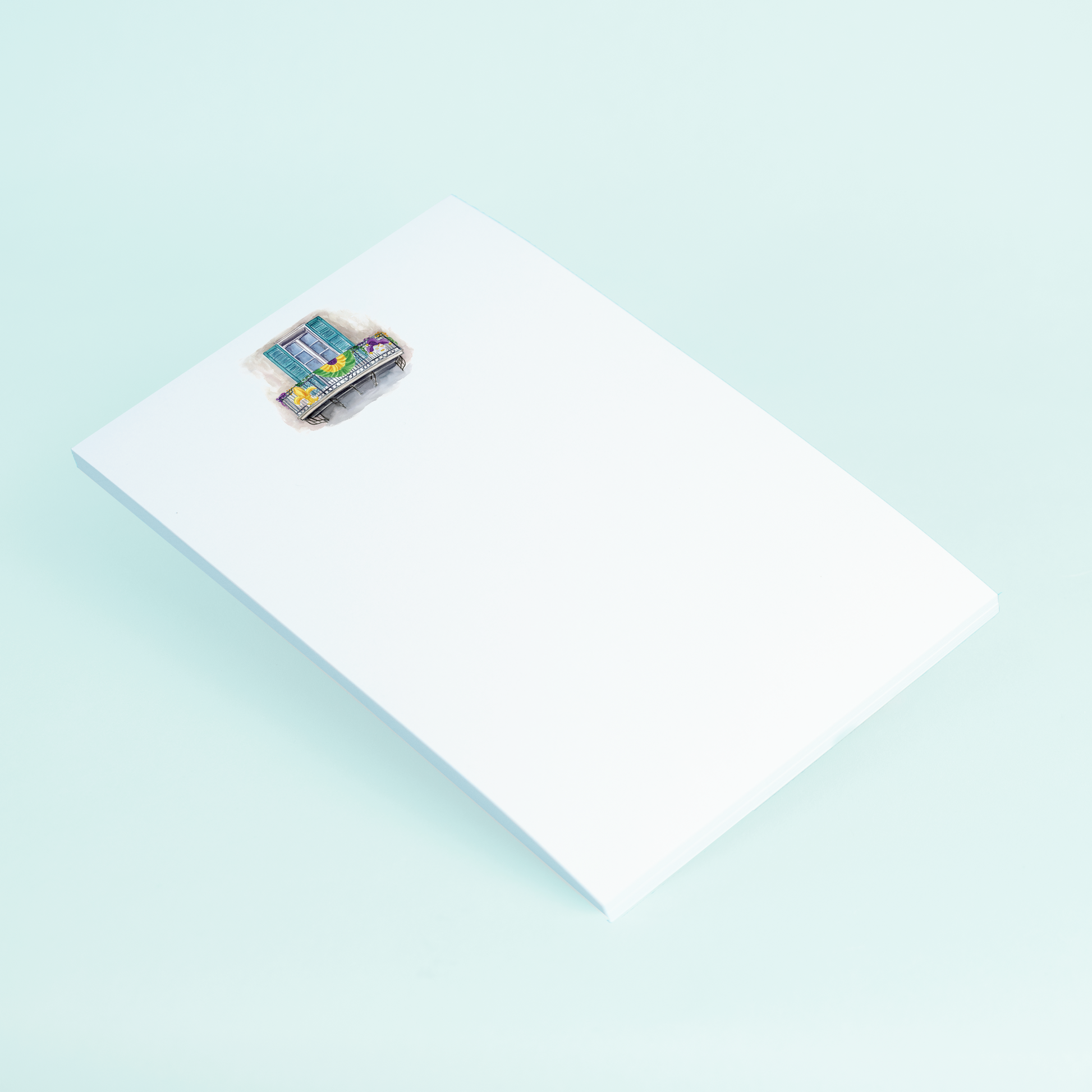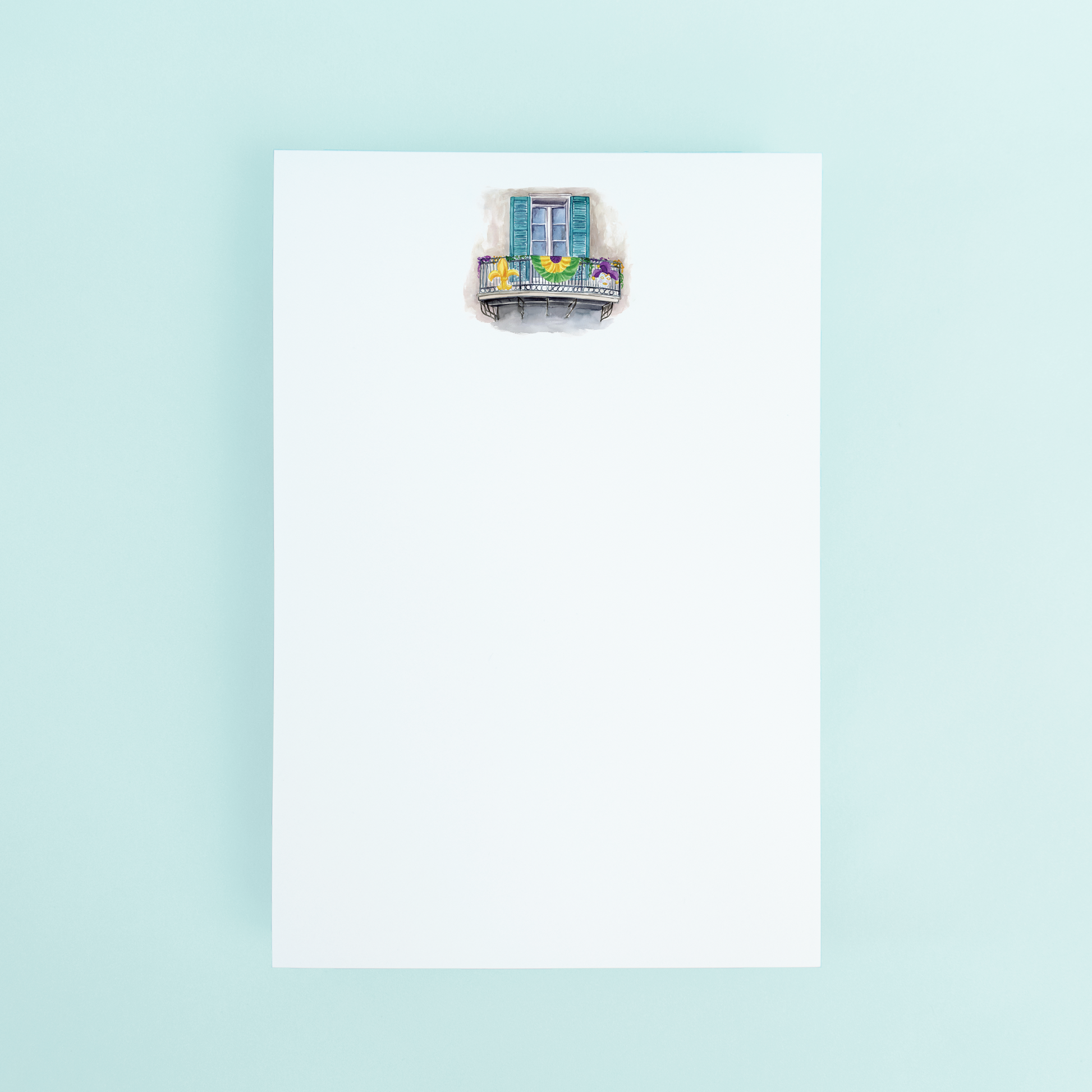 Introducing the stunning 4 x 6 notepad featuring the original watercolor art of Dallas-based artist Taylor Paladino. This unlined notepad showcases a single New Orleans balcony window adorned with festive Mardi Gras decorations, capturing the spirit of this beloved holiday.