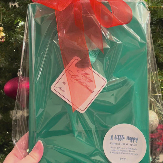 Includes a set of 3 premium gift bags, each with 10 sheets of luxe red tissue paper and an attached, coordinating gift tag — thoughtfully designed by A Little Happy, to make your gifting effortless and elevated. No last-minute runs for bags or tissue. No mismatched wrapping. Just beautiful, ready-to-go gifting!