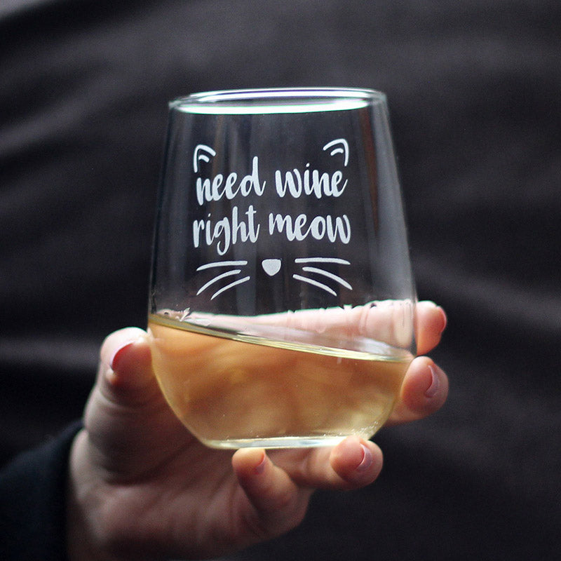 Need Wine Right Meow – Cute Funny Cat Stemless Wine Glass, Large 17 Ounces, Etched Sayings, Gift Box