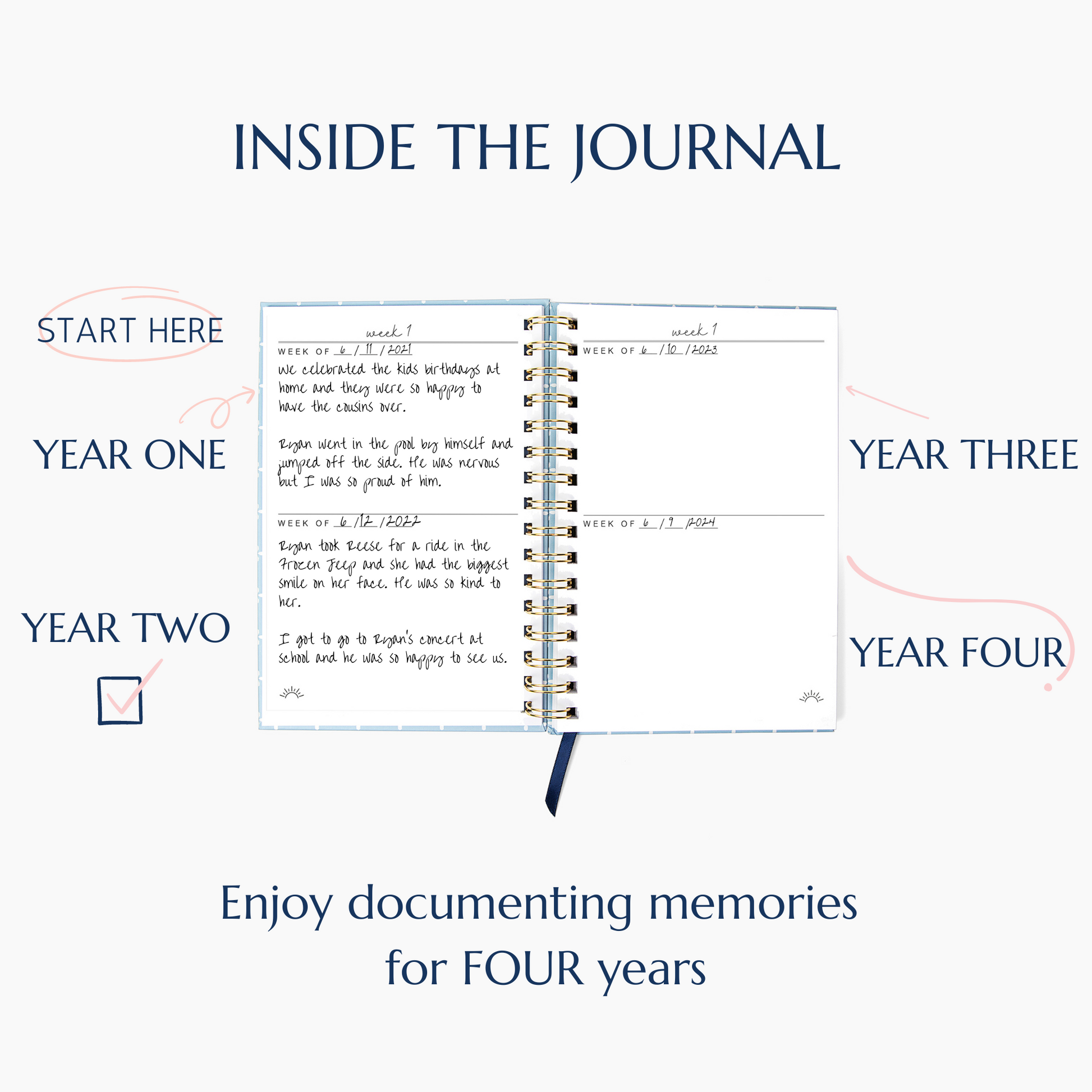 Capture the most treasured moments of joy as a mom with this Four-Year Journal. With an undated weekly layout, the journal offers the flexibility to start at any time and to document all of the little joys of each week. The Four year journal allows you to relive your happiest memories each year (like a time-hop for your memories!) and share them with your children for years to come. It's the perfect way to ensure that you never forget the simple yet extraordinary moments that happen every day.
