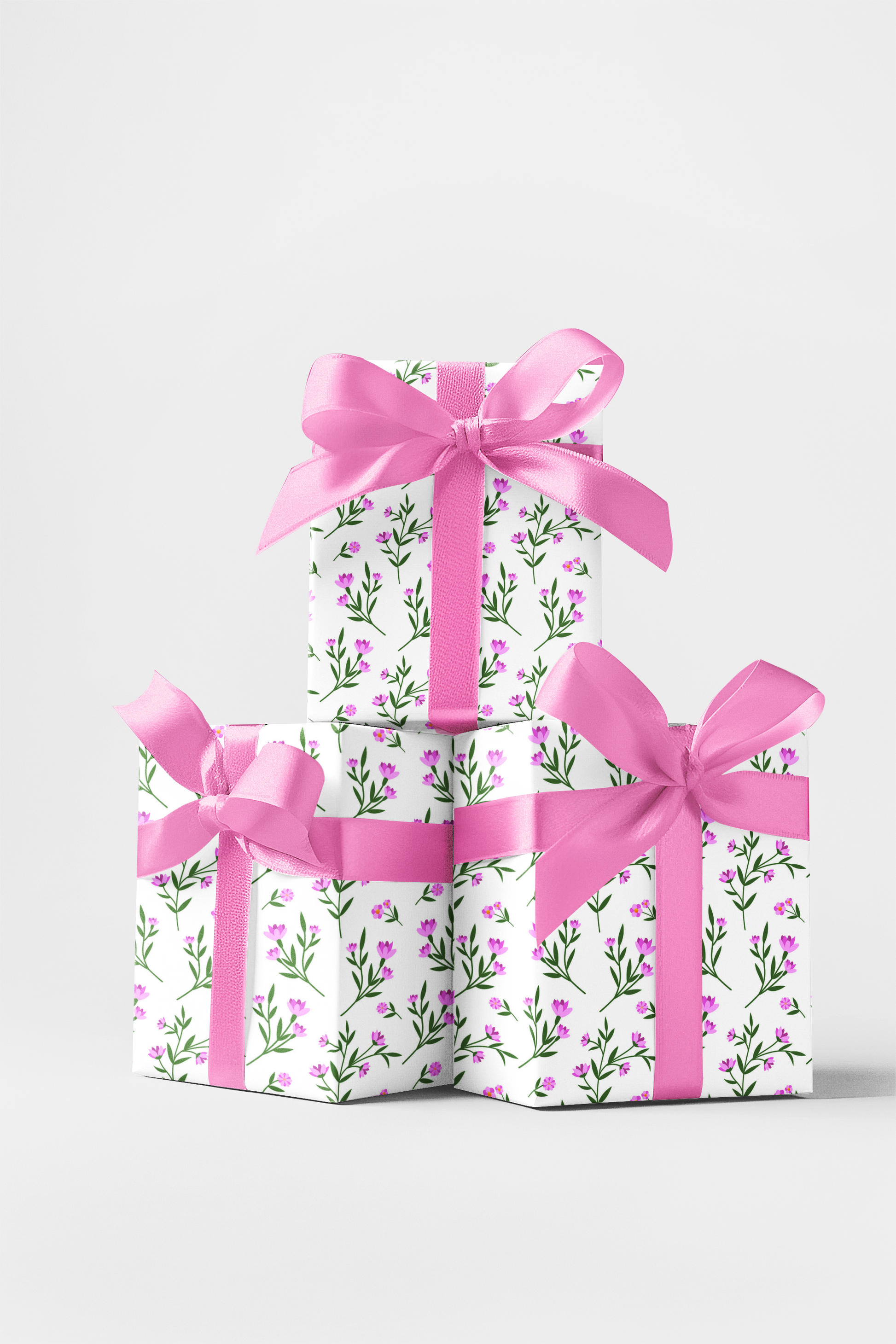 The design features dainty, fuchsia-pink blossoms scattered among slender, deep green stems, all set against a crisp white backdrop. The clean lines and cheerful color palette offer a modern take on classic botanical prints, perfect for adding an elegant and feminine touch to any package.