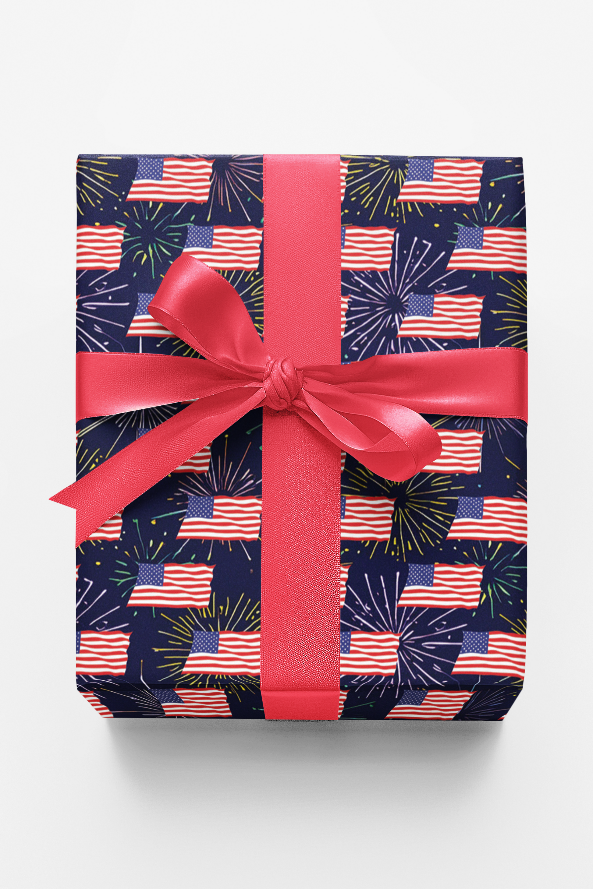 Celebrate in true patriotic style with our “Star Spangled Banner†wrapping paper! This bold design features a repeating pattern of American flags and bright fireworks set against a deep blue background. Perfect for the 4th of July, Memorial Day, Veterans Day, or any celebration that honors the red, white, and blue. Add a proud, festive touch to your gifts with this striking and timeless wrap.