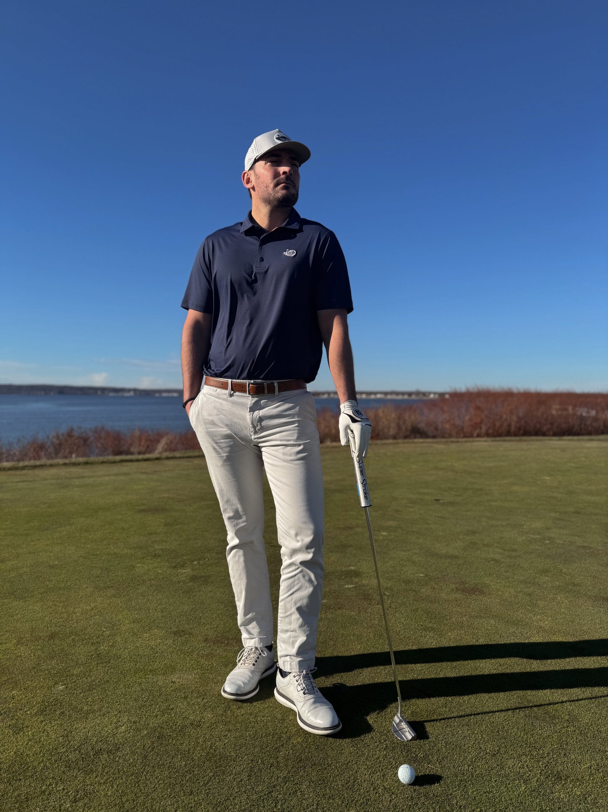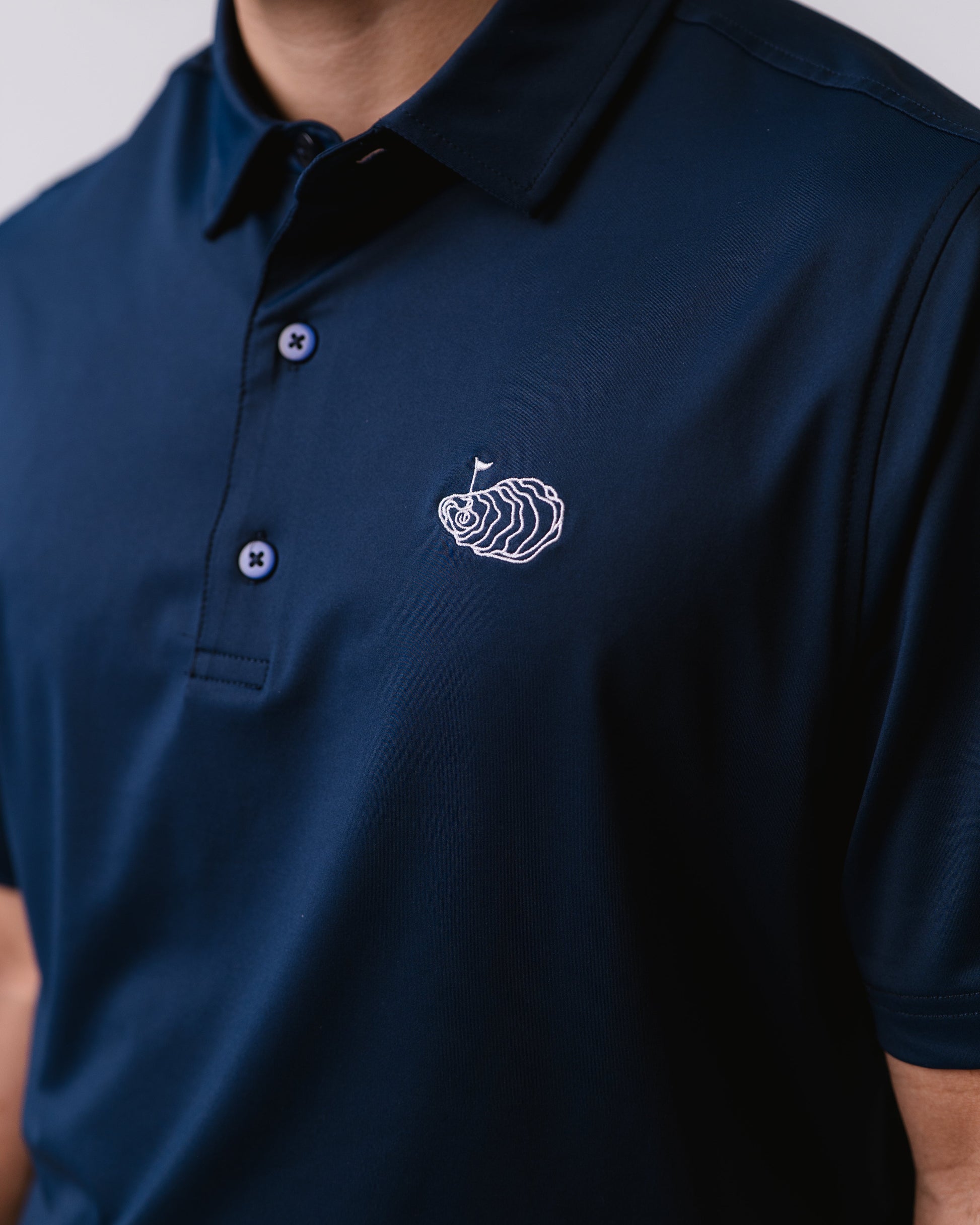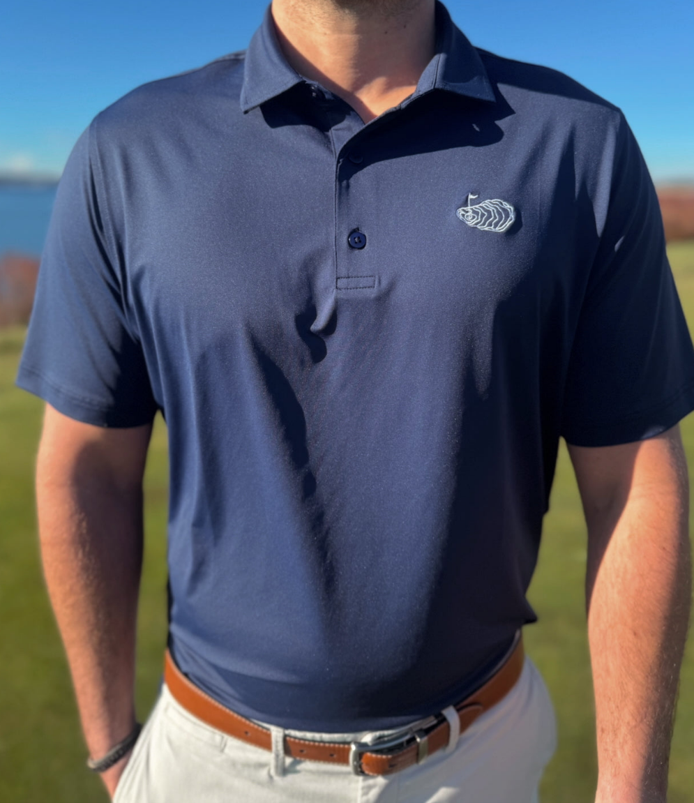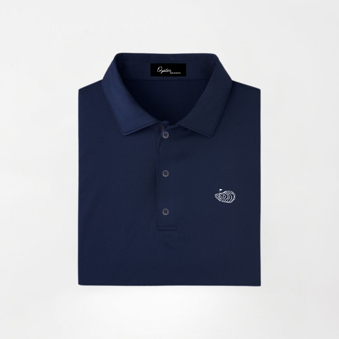 Introducing the admiral by Oyster Brands – set to have you commanding your rounds in style. A clean navy polo with the signature oyster logo embroidered in white - from tee to green to the 19th hole, let the admiral be your guide.